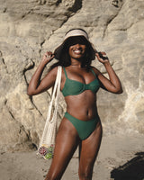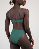 The textured Yvette Bottom is featured in a high-waisted silhouette with an elongating higher cut leg and a moderate coverage bottom fit. Made in Los Angeles